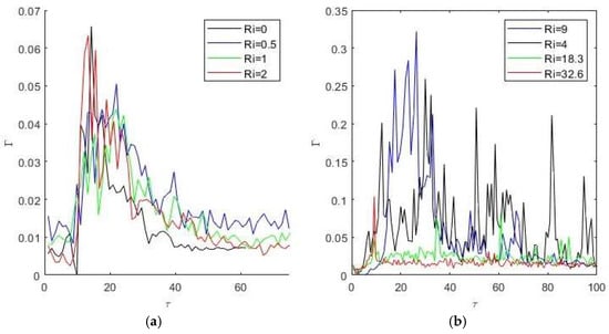 Combined time series of non-dimensional concentration for different Richardson numbers: (a) low Richardson numbers () and (b) high Richardson numbers ().
