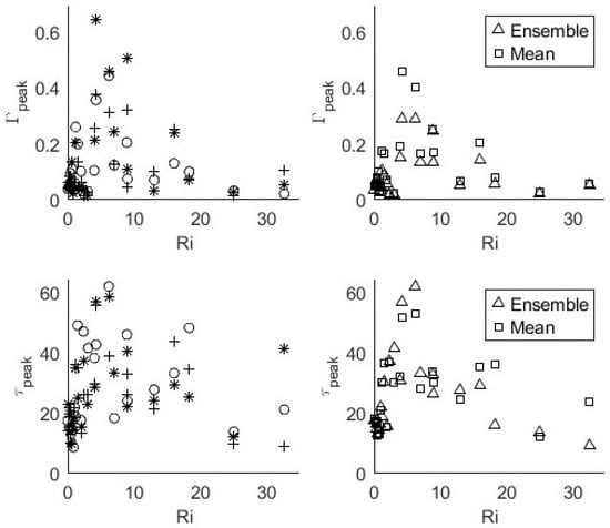 The mean behavior and the variability around that mean are illustrated in Figure 12. This shows the measured peak concentration and the time of the peak concentration for each experiment and all 23 Richardson numbers (left column of Figure 12). Also shown is the arithmetic mean of those measurements and the values derived from the ensemble averages. In all cases the mean value of is always greater than the peak value of the ensemble mean. This is because the peak values in the individual tests occur at different times. The mean value of is small for small Richardson numbers () and then jumps substantially for the transitional experiments () before reducing again for larger . The same is true for the timing of the peak. For the peaks all occur for which jumps as high as for before dropping back to around for higher .