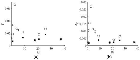 Plot of the mean (a) and standard deviation (b) of concentration as a function of source Richardson number for continuous release experiments for different source flow rates (Q). Q = 400 mL/min—circle and Q = 200 mL/min—solid. Reproduced with permission from [30].