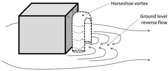 Schematic diagram of some features of the flow in the wake of a surface-mounted cube showing the horseshoe vortex (dashed lines) and reverse flow back toward the cube. Modified with permission from [30].