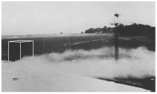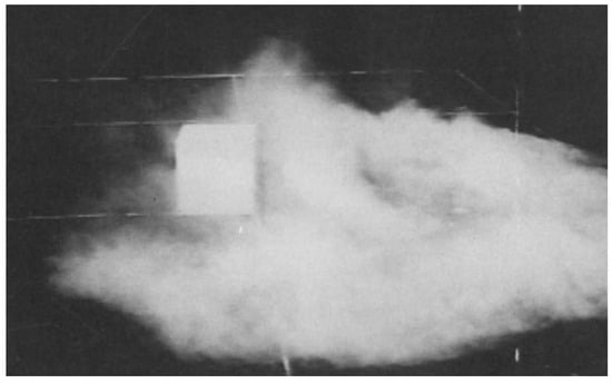 Conversely, Figure 16 shows an image from the full-scale Thorney Island Phase II tests for a high Richardson number flow ( = 34.8). Here the dense cloud collapses and flows around the building. This is consistent with the small-scale visualization test for = 24.5 shown in Figure 4. In both images the cloud is about 10–20% of the height of the building as it passes around, and no dense fluid is observed to flow up and over the building.