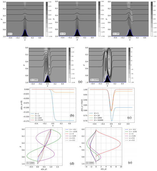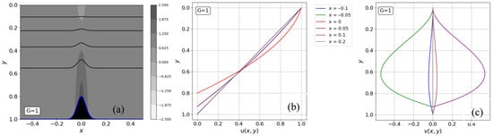 Here, G is the only parameter in the problem. In this case, the streamwise pressure gradient is only a function of x, and the velocity component, u, cannot display a change in concavity along the y direction, allowing no possibility of vortex formation. In other words, since for any x, the pressure gradient from Equation (36) is , which is independent of y for any x, thus driving the flow forward and enhancing the plate movement.