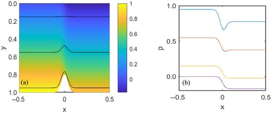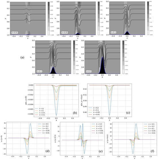 Figure 4a reflect a decrease in pressure with x and an increase with distance from the top towards the bottom boundary. The pressure gradient is zero upstream and downstream of the obstacle (h = 1). Referring to Equations (34)–(36) and