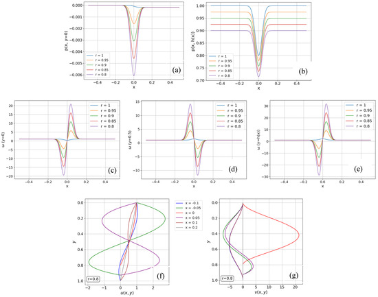 Figure 7, namely the distributions of pressure and shear stress along the top and bottom boundaries as well as the velocity distributions for r = 0.8. The behavior of the pressure becomes clearer when inspecting the pressure gradients from Equation (51) along both the top (