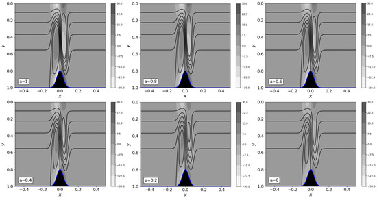 . Upon the further increase in the gravity gradient, the upstream vortex is further compressed and distorted while the downstream vortex continues to open at the top but with little change at the bottom (0 < a < 0.4). As the gravity gradient increases, gravity becomes weaker toward the bottom of the domain, weakening the overall effect of stratification. This occurs because stratification only affects the flow field in the presence of gravity, so as gravity weakens, the effect of stratification decreases, and the vortices, which only form due to stratification, become smaller and weaker.