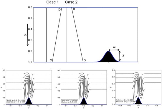 In particular, we assessed the conditions for the onset of vortex motion, which is reflected by the condition for flow separation. In this regard, Equations (39)–(48) for small and large G, as well as the general Equation (30), clearly reflect the role of density and gravity stratification in causing separation and vortex motion. We observe that for G = O(100), the flow field exhibits antisymmetric standing waves across the channel, especially above the obstacle region. For a higher G value, namely when G = O(1000), the standing waves give way to vortex flow upstream of the obstacle, spanning across the channel, accompanied by a significant distortion of the standing wave downstream of the obstacle. The singularity of the velocity predicted in Equation (43) is reflected in