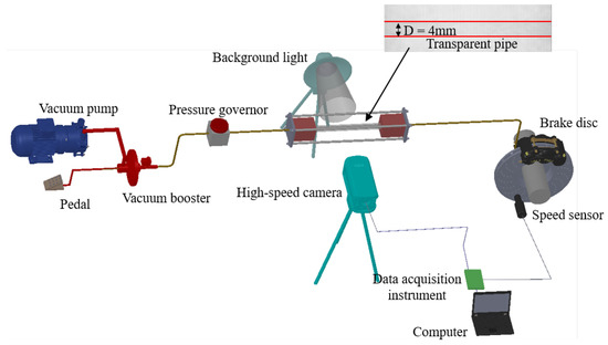 The experimental device is shown in Figure 1. It is a modified Santana 3000 ABS (Anti-braking system, Wanxiang Qianchao Co., Ltd.; Hangzhou, China) test rig, which mainly consists of a hydraulic brake system and a video acquisition module. The hydraulic brake system can control the wheel speed between 0–1600 r/min. A horizontally placed transparent quartz tube with an inner diameter and length of 4 mm and 150 mm, respectively, was installed in the hydraulic pipeline of the right front wheel of the brake platform. The transparent pipeline was equipped with a pressure sensor (Swiss Keller brand PA-25TAB, Beijing Handarsen Machinery Technology Co., Ltd.; Beijing, China) at the ends to measure the pipeline inlet and outlet pressures. The power supply for the pressure sensor was provided by a WD-5 regulated power supply. The pressure sensor used a 15 V power supply with a sampling frequency of 1 kHz. An OLYMPUS·ISPEED·2·MONO (4G) high-speed camera (Olympus Corporation; Tokyo, Janpan) with a resolution of 800 × 600 and a maximum frame rate of 3000 fps was used to record the two-phase flow in the transparent quartz tube. The frame rate used in this study was 100 fps. The BL series (Fuzhou Boring Imaging Equipment Co., Ltd.; Fuzhou, China) studio light was used as backlighting and a sheet of sulfuric acid paper was layered behind the quartz tube to improve the photograph’s quality.