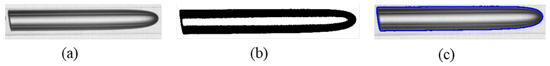 Based on the fitting of the upper and lower boundaries of the pipeline through the Hough transform, the bubble contour was extracted by performing the following steps: (1) The image was masked according to the upper and lower boundaries of the pipeline; (2) An appropriate threshold was selected for Otsu’s binarization of the image, and (3) Contour detection was performed for the image after binarization. The bubble foreground and background were distinguished by binarization. By contour detection, the bubble shape and position were obtained. Figure 3 shows the final contour extraction result.