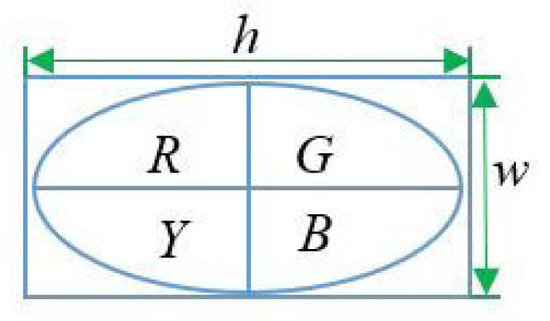 According to the characteristics of each bubble flow pattern described in Section 2.3.1, five bubble shape characteristics, namely area (S), aspect ratio (Ar), roundness (C), area symmetry (SS), and half-area symmetry (HSS), were used as the bubble classification criteria. As Figure 5 shows, the ellipse in the bubble diagram represents the bubble contour and the rectangle on the ellipse is the circumscribed rectangle of the bubble contour, with length and width of h and w, respectively. The two lines in the rectangle divide the circumscribed rectangle equally into four parts. The bubble contour is also divided into four parts by the two lines, with areas R, Y, G, and B. The area S refers to the outline area of the bubble, whereas L is the bubble circumference. The aspect ratio (Ar) is defined as the ratio of the longitudinal length of the bubble to the transverse length of the bubble, which can be obtained from the ratio of the width to the length of the circumscribed rectangle of the bubble (Ar = w/h). The roundness (C) represents the roundness of the bubble. It is calculated as