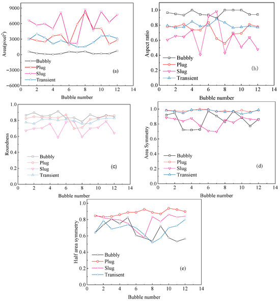 Figure 7a shows that the area can distinguish bubbles in bubbly flow from bubbles in the other flow patterns, whereas Figure 7b indicates the aspect ratio of bubbly flow bubbles is generally close to 1. According to Figure 7c, bubbles in bubbly flow and small plug flow exhibit greater roundness, whereas those in transient and slug flow are less round. This classification characteristic plays an auxiliary role in the identification of bubbly and slug flow bubbles. As shown in Figure 7d, plug flow bubbles have greater area symmetry. Furthermore, one side of the slug bubble is sharp as a bullet while the other side is cylinder-like leading to less area symmetry of slug flow bubbles. Transient flow bubbles are asymmetrical in shape but can have symmetrical areas. Therefore, the area symmetry can be used to distinguish plug flow bubbles from slug flow bubbles. Referring to Figure 7e, the half-area symmetry can be used to differentiate plug flow bubbles from transitional bubbles.