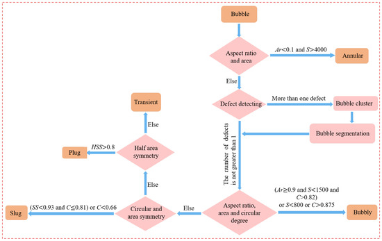 Figure 8 presents the method for flow pattern recognition based on the classification characteristics. The annular flow bubbles are distinguished by their aspect ratio and area. The bubbly flow bubbles are classified by area, roundness, and aspect ratio. The slug flow bubbles are determined by area symmetry and roundness. The transition and plug flow bubbles are differentiated by the half-area symmetry.