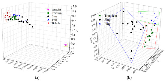 The scatter diagram of bubble flow pattern recognition. (a) roundness (C); (b) half-area symmetry (HSS).