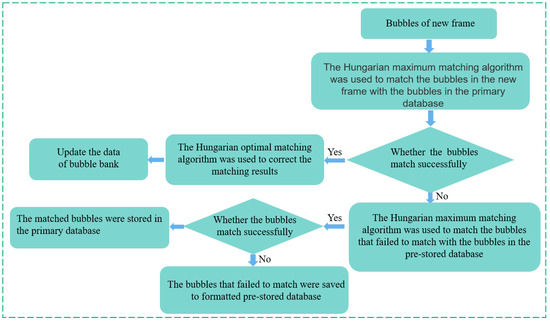 Maximum matching [34] and optimal matching [35] are the types of Hungarian algorithms. The maximum matching can obtain a matching method with the maximum number of matching groups between two groups of variables. The optimal matching is determined based on the consumption matrix to minimize the total cost of matching. In the tracking algorithm of this study, the Hungarian maximum matching algorithm was first used to find bubbles with similar characteristics in the new frame. The Hungarian optimal matching algorithm was then used to find the most reasonable matching scheme.