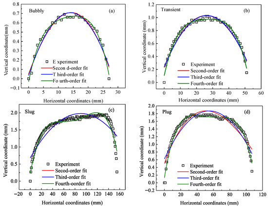 where is the function of the integral curve, and is the abscissa of the rightmost point of the bubble contour. The [0,] area is divided into equal parts for integration. The length of each integral region is . The bubble contours in this study were discrete sampling points. The derivative value of the curve at each point is required by calculating the residual term. To observe the error of quadrature by the compound trapezoidal formula for bubble contours of each flow pattern, four bubble contours of different bubble flow patterns were fitted polynomially. As seen in Figure 16, the fitting effect of the fourth-order polynomial is good. The fitting coefficients and fitting residuals are summarized in Table 2.