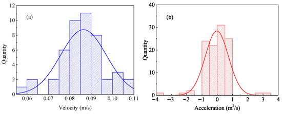 The real-time position and velocity of the bubbles can be used to obtain the real-time acceleration of the bubbles. The acceleration represents the bubble’s inertial force. Figure 25 presents the acceleration distribution of bubbles with different bubble flow patterns. The bubble acceleration in the pipeline is between 0–4 m/s2. The high acceleration of slug flow bubbles, bubbly flow bubbles, and bubble clusters accounts for a relatively large proportion. The proportion of high acceleration of plug flow and transient flow bubbles is much smaller. Bubbles with different velocities collide to form a bubble cluster, which will have a relatively large acceleration under the action of inertial. So, the bubble clusters have the highest proportion of large acceleration. Presumably, the acceleration of bubbles in the pipeline is changeable and intermittent. Figure 26 depicts the evolution of bubble velocity and acceleration during bubble acceleration phases. The uneven turntable surface induces fluctuating bubble acceleration, resulting in undulating velocity. Despite this kinematic instability, bubble morphology remains stable due to delayed feedback.