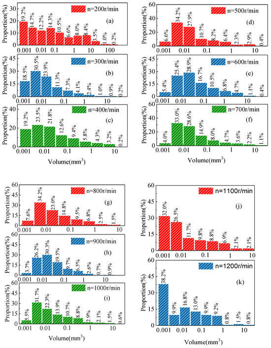 The volume of bubbles that appeared in the hydraulic braking pipeline was as small as ten minus cubic millimeters and as large as hundreds of cubic millimeters. Statistics of the bubble volume distribution at different wheel speeds are shown in Figure 18.