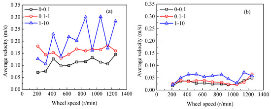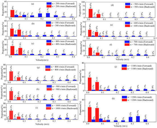 The bubble was tracked to obtain the bubble velocity. The velocity of the bubble reflects the movement of the bubble and the flow state of the two-phase flow. The average velocity of a single bubble in the entire flow process in the window was used as the bubble velocity. The velocity distribution of the bubbles at different wheel speeds is shown in Figure 19.