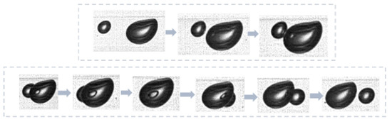 For bubbles with relatively regular shapes, some studies used the volume formula of a sphere or an ellipsoid to solve the bubble volume [31]. For bubbles with complex shapes, researchers used the complete matching method based on a virtual stereo vision to reconstruct the bubbles in three dimensions. This method uses one mirror so that a camera can capture images of bubbles at different angles and carries out a three-dimensional reconstruction of complex bubbles based on the captured images [32,33]. In this study, the bubbles are approximated as rotating bodies (shown in Figure 14), and the bubble volume is calculated by Equation (1).