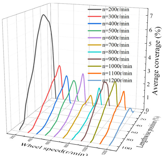 According to Figure 23, the peak of average coverage always appears in the middle and upper parts of the pipeline. Most of the bubbles are concentrated in the position of 10–20% from the top-down of the pipeline. Bubbles at the 200 r/min wheel speed have a wider distribution of locations in the vertical direction due to the larger bubble size. The peak value of the average coverage rate at 200 r/min is about 40% from the top-down of the pipeline, and the average coverage rate of the entire longitudinal pipeline is relatively large. Increasing wheel speed elevates brake pressure while reducing gas holdup in the pipeline and lowering peak average coverage. Furthermore, under the action of inertial force, the bubble does not have time to float up to reach the position of the pipeline wall. So, as the wheel speed increases, the average coverage rate peak gradually moves down. Until the wheel speed of 1200 r/min, the peak of the average coverage rate appeared at approximately 25% from the top to the bottom of the pipeline.
