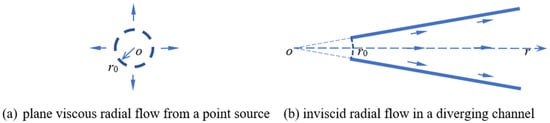 To our knowledge, the radial flow of a particle-laden (viscous or inviscid) suspension shown in Figure 1 has been rarely studied in the literature, although radial flow of a clear fluid (without dispersed particles) from a point source has been the topic of several known works [,,,]. Clearly, the case (a) is an r-dependent axisymmetric flow, and the inviscid radial flow in a diverging channel shown in the case (b) depends solely on the radial coordinate r because the inviscid flow is free to slip on the straight walls. Since the inviscid flow could often offer an acceptable approximation to the viscous flow with no-slip boundary conditions in the flow region away from the solid walls, the inviscid solutions derived here could be useful for the multiphase viscous radial flow of particle-laden fluids in the flow region away from the solid walls (e.g., along the midline of the diverging channel).