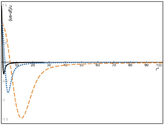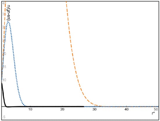 For the higher bubble-to-fluid inlet velocity ratio u0S = 10u0f, it is seen from Figure 3 that the velocity of bubbles of a moderate Stokes number presented by = 1 remains faster than the fluid within the distance above (r* = 3), while the velocity of bubbles of a larger Stokes number presented by = 0.01 remains faster than the fluid within the large distance abound (r* = 33). In particular, it is seen from Figure 3 that the normalized velocity difference given by Equation (22) in the case = 0.01 can be very high (beyond 100, too high to be shown entirely in Figure 3) because the suspension velocity diminishes quickly while the bubbles of large Stokes number respond to the decelerating flow field much slower than the suspension.