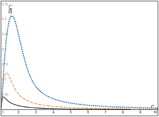 The dimensionless function Ω(r*) defined by Equation (24) for the velocity difference ((uS-uf)/u), for the three values of = 1 (dotted blue), 3 (dashed orange), and 10 (solid black), respectively, where .