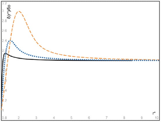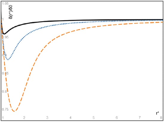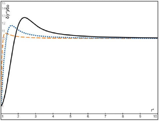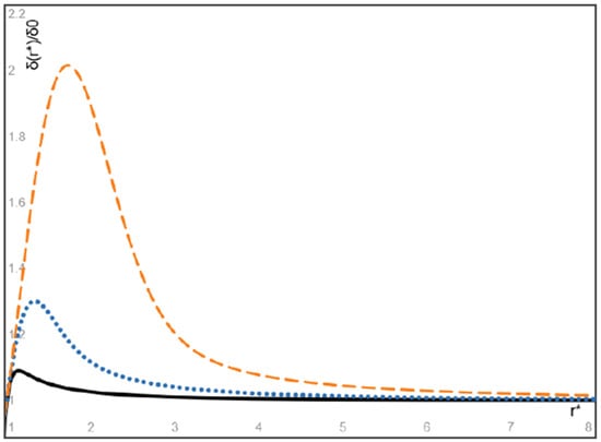 On the other hand, the dimensionless steady volume fraction of particles given by Equation (34) is plotted in Figure 8 for massless bubbles () with three values of = 1, 3, and 10, respectively. It is seen from Figure 8 that the volume fraction of massless bubbles attains its maximum at a location near the entrance of the flow, and after then, the bubble volume fraction monotonically decreases with increasing radial coordinate and converges to a finite value. Particularly, the maximum value of the particle volume fraction and its location approach the inlet particle volume fraction δ0 and the entrance location r = r0 as the value of approaches infinity, or equivalently, as the modified Stokes number of bubbles approaches zero.