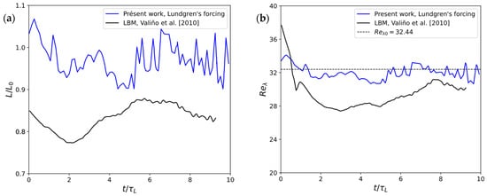 Figure 2a,b, respectively, present the time evolution of the integral length scale normalized by the target value and the Taylor microscale Reynolds number . The figures show a comparison with the results by Valiño et al. [28], obtained using LBM with Lundgren’s forcing model. Our results tend to be overall in better agreement with the target turbulence parameters. Our integral length scale exhibits a rather stable behavior around its target value, with less than 10% fluctuations. In contrast, the results from Valiño et al. [28] show an initial decrease, followed by a gradual increase towards an asymptotic value remaining lower than the target (around 82% of the target). Similarly, our results for get very quickly close to the target value , and show limited oscillations. On the contrary, results by Valiño et al. [28] show a pronounced drop at early times, with a slow recovery over time. These differences in behavior could be due to differences in the LBM used in both works: Valiño et al. [28] have used a D3Q15 lattice with the Bhatnagar–Gross–Krook’s collision operator (BGK) [29], while the present study uses a D3Q18 lattice with Eggels and Somers’s collision operator [18].