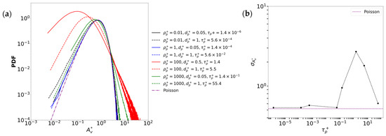 The qualitative observation that clustering is maximal for Stokes numbers close to 1 is quantitatively supported by the PDFs of the normalized Voronoi cell volumes , presented in Figure 5 along with their standard deviation as a function of the Stokes number. The PDFs, obtained using the method of Monchaux et al. [40], are compared with the Poisson distribution derived from the formula of Ferenc & Néda [41], which serves as a reference for random particle distribution. For small values of the Stokes numbers (from to ), the PDFs closely follow the Poisson distribution, indicating no clustering, which is consistent with tracer-like behavior. This observation is also supported by the low standard deviations of the corresponding PDFs in Figure 5b, which remain close to the theoretical Poisson value of 0.52. As increases, clustering intensifies, as characterized by the variance of the normalized Voronoi cell PDF, reaching a maximum at . This is evidenced by a significant shift of the peak value of the PDFs toward smaller Voronoï volumes, accompanied by a broader distribution including larger volumes. This reflects the coexistence of regions of strong particle clustering with regions of large voids, keeping the average concentration constant, since the number of particles and the simulated volume remain unchanged. At such a Stokes number, the standard deviation peaks around 3, highlighting a strong deviation from randomness, well above the Poisson benchmark, characterized by a much lower standard deviation of 0.52 [34,35]. For larger Stokes numbers (e.g., and ), the PDF peak shifts back toward larger Voronoï volumes, and the standard deviation decreases significantly. Particles with higher inertia filter short time fluctuations in the flow. They become insensitive to the small scales of turbulence, making them less prone to ejection by small turbulent structures, leading to a more homogeneous spatial distribution.