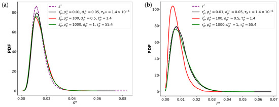 Figure 3a shows that the PDF of the normalized invariant from our simulation results (blue line) closely follows those deduced from the PS (green line) and LBM (black line) results obtained by Valiño et al. [28] in the central region, where the probability density is the highest. Small deviations between the two works appear when moving toward the extremities of the PDF. As far as the PDF of the normalized invariant is concerned, Figure 3b shows a very good agreement between both works. The three sets of results are almost coincident, displaying a similar decay pattern, with a rapid drop-off as increases. Only very minor discrepancies are noticeable in the very low probability region for large values of .