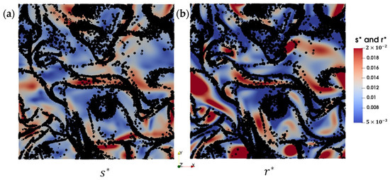 As a visual confirmation of this interpretation of particle clustering, Figure 7 displays the spatial distribution of particles of on top of color maps showing the instantaneous fields and . It shows that regions of high strain rate in the flow often coincide with regions of high vorticity. However, low vorticity regions seem to be decoupled from strain rate, as previously noted by Jiménez et al. [42] and Wang et al. [43]. Since particles are ejected from high vorticity regions (high ), Figure 7 clearly shows that regions of high are depleted in particles, which preferentially cluster in areas of low , where the strain rate remains non-negligible. This behavior explains the significant difference between the PDFs of and when clustering happens, while the PDF hardly varies with Stokes number and remains close to the one in the flow . This aligns with the findings of Wang et al. [43].