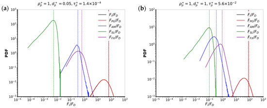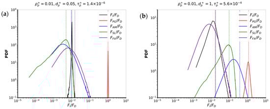 Probability density functions of the ratio of the magnitude of each force to the magnitude of the drag force. (a) case 7: ; (b) case 8: . The vertical lines show the positions of the average.