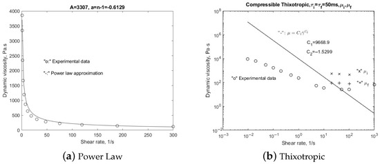 In EV manufacturing plants, various glues are utilized for sealing and other applications. The complex non-Newtonian rheological properties have presented tremendous challenges in the precision control of dispensing systems, in particular, with the considerations of variable speeds, durations, and flow rates [16,17]. In our earlier studies of such non-Newtonian fluid models, a Bingham non-Newtonian model with a peak dynamic viscosity of a minimum dynamic viscosity of and a critical shear rate of has been employed. The rheology of the polymer material in question is very much shear- and strain- rate-dependent [18,19]. In the computational studies presented in this paper, we employ both the power law and thixotropic non-Newtonian, almost compressible, or nearly incompressible, rheological models as depicted in Figure 2.