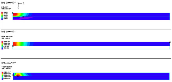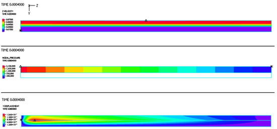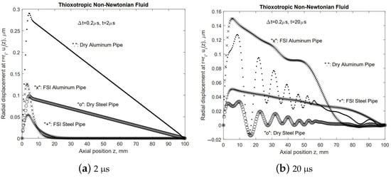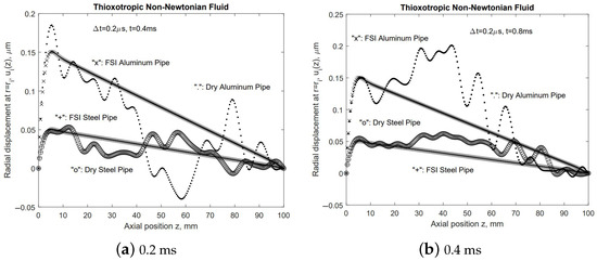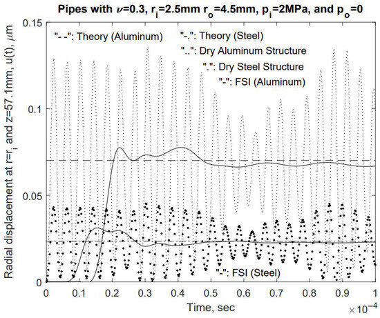 In the study of the dispensing of thixotropic non-Newtonian, almost compressible fluids, we have established that a significant inlet and outlet pressure difference is needed to squeeze out the super viscous polymers [13]. With the consideration of initial transients, namely, the inlet flow rate is elevated to the steady level within a short period, in this paper, we adopt a thixotropic model, as depicted in Figure 2. In the series of FSI simulations using Bentley Systems ADINA FSI software, we employed a time step size of , along with a ramp size of As demonstrated in Figure 9, Figure 10, Figure 11, Figure 12 and Figure 13, the dry structure exhibits much less damping in comparison with FSI systems with internal viscous fluids. Moreover, in so-called dry structural models, the same pressure distribution from the inlet to the outlet established in the steady solution tends to introduce a linear structural dynamic response that satisfies the structural boundary conditions, which are fixed at both ends. Because the high aspect ratio is , for the bulk of the tube, the radial direction displacements still resemble those from the thick-wall cylindrical pressure vessel, as shown in Figure 4, Figure 5 and Figure 6.