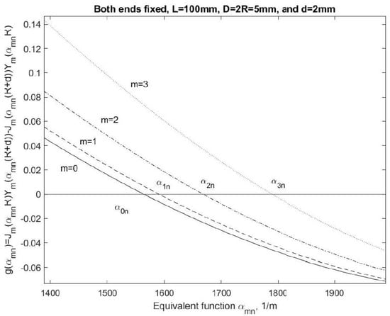 Note that the solution to Equation (19) is a combination of a typical Bessel function of the first kind of order m, namely , and a typical Bessel function of the second kind of order m, namely, . In this dispensing system, because of the extremely high pressure introduced to overcome the excessive viscosity, the tube or pipe resembles a typical thick wall cylindrical pressure vessel with Thus, the special solution can be expressed as a combination of a Bessel function of the first kind and a Bessel function of the second kind . From Equation (18), we have , where and are constants that are dependent on the initial and boundary conditions, and the natural frequency will be determined by the boundary conditions of , namely . Notice that nontrivial solutions for and must exist for
