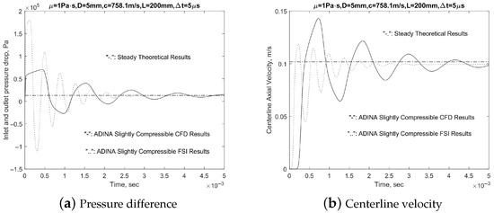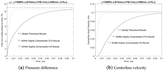 For the precise delivery of these very complicated thixotropic non-Newtonian, almost compressible fluids, the wave speed, which is dependent on the bulk modulus or the reciprocal of the compressibility, as well as the fluid–structure interaction (FSI) effects, can play an important role. Moreover, as shown in Figure 14 and Figure 15, although both compressible fluid models and full-fledged FSI models yield oscillatory pressure differences and average axial velocity during the developing flow phase, the frequencies have significantly increased, whereas the damping ratios stay roughly the same. It is not difficult to conclude that the added stiffness part of the FSI effects seems to be more prominent, which matches with our physical intuitions, namely, both aluminum and steel tubes are very strong, and the rigid tube assumption is reasonable. Moreover, as shown in Figure 14 and Figure 15, both FSI and CFD analyses produce accurate solutions oscillating around the steady theoretical solutions, as elaborated in our earlier reports and Refs. [12,13].