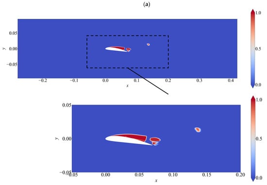 Figure 10 plots the contour of predicted cavitation fields with velocity vectors in a typical cycle from t0 to t0 + 5 ΔT. Common features can be found and summarized from these figures. First, cavitation will not appear in the region with uniform flows. Second, except for the solid region inside the hydrofoil, the location where local velocity is zero tends to indicate that this is the interior part of attached cavitations or cloud cavitations (see Figure 10a–c). In contrast, the presence of shear velocity around this core region of zero velocity reflects the location of the gas–liquid interface. Such cavitation, including attached and cloud cavitation, generally exhibits larger-scale structures due to the inclusion of significant internal zero velocity regions. This phenomenon also suggests that the zero velocity inside the attached cavitation fixes it in a relatively stable stationary state on the hydrofoil suction surface, while the shear velocity at its gas–liquid interface changes its morphology to some extent. In addition, the velocity characteristics of large-scale cloud cavitation suggest that its motion downstream relies mainly on the overall rotation triggered by shear velocity at the gas–liquid interface, rather than on the streamwise velocity inside.