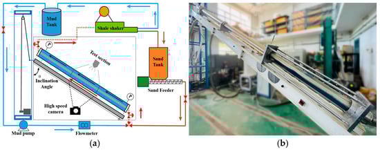 Experimental setup: (a) schematic diagram of the test facility; (b) picture of the cuttings transport test.