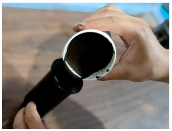 To ensure high controllability and repeatability of the experimental fluid system, the purified drilling fluid was then transferred to a designated reservoir tank for subsequent use in driving the annular circulation flow. At the start of each experiment, a prescribed amount of pretreated particle samples was added to the drilling fluid according to the test conditions. A variable-frequency centrifugal pump was then activated, and the flow rate was gradually adjusted to the desired target value. On this basis, a particle injection system was used to uniformly introduce a preset ratio of simulated cuttings and blocky cuttings into the flow field. To capture the transient transport behavior of cuttings within the annulus, a high-speed imaging system was employed to continuously record their motion trajectories, providing dynamic information on key processes such as deposition, suspension, and retention. After the injection process was complete, the liquid–solid mixture passed through a vibrating screen, allowing the drilling fluid to be separated and recovered for reuse in subsequent tests. Once the cuttings bed reached a steady state, predefined scale markers on the transparent pipe wall were used to measure the stable arc length of the bed under various test conditions. Flow rate was then varied via the frequency control system, and the tests were repeated under different wellbore inclinations, with 90° representing a horizontal well section. For each working condition, once the flow regime stabilized and the cuttings bed morphology ceased to change, the positions of three pre-marked scale points along the wellbore were recorded. These samples were utilized to determine the average arc length (L) of the cuttings bed, as illustrated in Figure 4. The resulting arc length data served as the basis for subsequent quantitative analysis of cuttings bed thickness and spatial distribution characteristics [18,19].