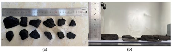 To precisely simulate the movement of blocky cuttings within wellbores experiencing instability, samples of blocky cuttings were obtained directly from an active shale gas drilling operation; blocky cutting samples were collected from an actual shale gas drilling site, and the selected material had a particle density of 2.4 g/cm3. After drying, the samples were subjected to standard sieving procedures. Blocky cuttings with particle sizes ranging from 20 to 40 mm were selected as the primary research objects. Their morphological features are illustrated in Figure 3. To better mimic the geometric characteristics of naturally fractured cuttings in shale formations, the particles were further filtered based on their two-dimensional shape factor—specifically, the Feret diameter ratio [17]—restricted within the range of 0.2 to 0.4. This ensured that the selected particles resembled the irregular, large-sized fragments typically generated by brittle fracturing in shale. This method effectively simplifies the treatment of irregular particle dimensions during experimental analysis and modeling, laying a solid foundation for the subsequent quantitative study of deposition and transport behavior.