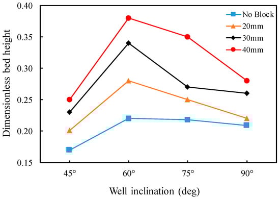 Well inclination serves as a key controlling factor influencing both hole cleaning efficiency and the morphology of cuttings deposition; its variation directly governs the transport paths and accumulation trends of cuttings within the annulus. At high inclination angles, the interplay between gravitational force and fluid drag becomes highly nonlinear rather than linearly additive, leading to significant changes in particle settling velocity and residence locations. Figure 7 illustrates the transport behavior of blocky cuttings (20–40 mm in diameter) and the corresponding development of the cuttings bed under various wellbore inclinations ranging from 30° to 90°. Experimental results indicate that as the well inclination transitions from vertical to horizontal, the thickness of the cuttings bed increases significantly, reflecting a continuous decline in cuttings transport capacity. Notably, at an inclination of 60°, the system exhibited the most pronounced decline in transport performance, indicating a higher propensity for cuttings to settle and form a continuous bed structure at this angle; the maximum height of the dimensionless cuttings bed can reach 0.38 ± 0.03. This phenomenon suggests that within the critical inclination zone (approximately 45°to 75°), hole cleaning efficiency becomes highly sensitive to wellbore geometry, and the risk of cuttings accumulation increases markedly.