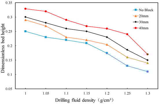 Drilling fluid density is another key hydraulic parameter governing cuttings suspension and controlling the development of cuttings beds, exerting a significant influence on hole-cleaning efficiency. As illustrated in Figure 10, an increase in drilling fluid density significantly improves the suspension capacity of the fluid system. This enhancement is clearly reflected by the consistent reduction in the thickness of the cuttings bed across the tested density range. Higher fluid density generates greater buoyant force, effectively offsetting the gravitational settling tendency of large-sized cuttings within the annulus. This not only promotes more uniform cuttings distribution but also delays the onset of bed formation, thereby contributing to improved hole cleaning performance in horizontal well sections.