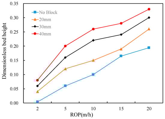The rate of penetration (ROP) is a fundamental operational parameter that directly governs the generation rate of cuttings at the bit. A higher ROP results in a greater volume of cuttings being produced over a given time interval, thereby placing increased demands on the carrying capacity of the drilling fluid. Consequently, ROP exerts a substantial influence on the cuttings transport dynamics within the annulus and serves as a key factor affecting the overall effectiveness of hole cleaning. Failure to appropriately match ROP with fluid transport capabilities may lead to excessive cuttings accumulation, elevating the risk of bottomhole packing or stuck pipe incidents. Typically, the mechanical drilling rate is defined as the linear velocity of the drill bit advancing axially along the wellbore, measured in meters per hour (m/h). As shown in Figure 11, when the ROP remains below 5 m/h, the volume of cuttings generated per unit time generally remains within the transport capacity of the drilling fluid. Under these conditions, the balance between cuttings production and removal is effectively maintained, leading to the formation of a relatively stable cuttings bed in the annulus without substantial accumulation. This equilibrium minimizes the likelihood of hole cleaning inefficiencies or the development of cuttings-induced flow obstructions.