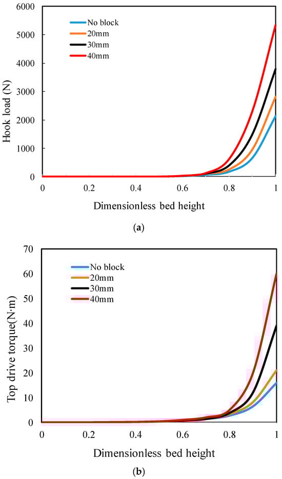 Additional hook load and torque of drill pipe at different dimensionless bed heights: (a) additional hook load; and (b) additional torque.