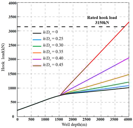 To quantitatively investigate the effect of average cuttings bed height on friction and torque response along the wellbore section, this study focuses on the high-angle and horizontal sections of the well. The interval with a wellbore inclination angle greater than 60° between 1560 m and 4000 m is designated as the main cuttings accumulation zone. It is assumed that within this interval, the average cuttings bed height is uniformly distributed along the section, with the bed thickness treated as a first-order control variable. The simulation conditions select the drill bit position at a depth of 4000 m to analyze the increments in hook load and rotary table torque generated during tripping out as the drill string moves upward from the horizontal section through to the cuttings bed zone. Figure 13 illustrates the response characteristics of hook load variation with well depth during tripping out under different dimensionless cuttings bed heights. The tripping out path covers the interval from the high-angle section at 1560 m depth to the horizontal well bottom at 4000 m depth, simulating the axial additional load variations caused by cuttings bed accumulation.
