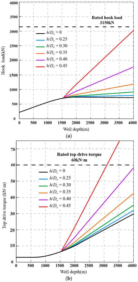 The figure shows that from the well depth of 1560 m, as the well depth increases, the additional value of the cuttings bed to the hook load gradually increases and reaches the maximum at the bottom of the well (4000 m). This trend reflects the typical “length-accumulation” characteristic of the cuttings bed’s contribution to the hook load; the longer and thicker the cuttings bed, the greater the pushing friction resistance the drill string must overcome. Under ideal clean wellbore conditions without cuttings accumulation, the maximum hook load during tripping out is 1014.4 kN, significantly lower than the rig’s rated hook load of 3150 kN, indicating safe operation. When the dimensionless cuttings bed height is less than 0.25, the additional axial load induced by the cuttings bed is weak, with hook load increases generally under 10%, allowing the system to maintain stable operation. However, once the dimensionless cuttings bed height exceeds 0.25, the hook load shows an accelerated upward trend, and, at 0.45, simulation results indicate a hook load of 3313.6 kN, exceeding the rig’s rated load limit. At this stage, the tripping resistance includes not only the drill string’s self-weight and basic friction but also the large-scale particle accumulation and blocking force imposed by the cuttings bed against the ledge, manifesting a pronounced bulldozing effect. If the cuttings bed height continues to increase, the additional friction will rise at a steeper rate, placing the hook load system at severe overload risk. Therefore, from a tripping safety perspective, when the dimensionless cuttings bed height approaches or exceeds 0.45, continuous upward tripping operations should be performed with caution. It is recommended to prioritize wellbore cleanliness evaluation and cuttings bed height monitoring before tripping and, if necessary, use agitation tools or high-rate circulation to clear bottom deposits, thereby reducing tripping resistance and preventing stuck pipe due to insufficient hook load.