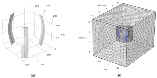 The mesh quality critically determines the accuracy of CFD simulations for vertical axis wind turbines (VAWTs), particularly at low Reynolds numbers, where flow separation and boundary layer effects are prominent [39]. A cylindrical computational domain was used, extending ten rotor radii in all directions from the turbine center to avoid confinement and allow full wake development [40]. The domain was divided into two zones: a rotating inner region containing the blades and a stationary outer region. The rotating zone employed a structured swept mesh to resolve the near-wall gradients, whereas the outer region used unstructured tetrahedral elements to capture the downstream vortices and flow detachment [41]. A transition interface with prism layers ensured continuity across the rotating–stationary boundary [42]. Inflation layers were applied around the blade surface, with a first layer height selected to maintain y+ < 5. Five layers were used, with a 1.2 growth rate and thickness calibrated using the Blasius solution, enabling an accurate boundary layer resolution without wall functions [43]. The mesh independence was confirmed using five refinement levels, ranging from 5775 to 137,057. A variation of <1% in Cl/Cd between the highest resolution meshes confirmed convergence. A 137,057-element “normal” mesh was adopted for all cases, providing <0.1% variation in the aerodynamic coefficients [44]. The average mesh skewness was below 0.23, and the orthogonality exceeded 0.91. No invalid cells or negative volumes were detected, which ensured the solver compatibility [45]. The domain dimensions followed the best practices, extending at least ten rotor radii to prevent pressure reflections and blockages [46]. A parametric script automated mesh generation based on geometry inputs, ensuring reproducibility across 42 simulations [47]. COMSOL’s rotating machinery interface of COMSOL was used to handle the domain coupling, with non-conformal boundaries enabling smooth velocity and pressure transfer [48]. This meshing protocol consistently resolves the pressure, vorticity, and aerodynamic forces across curvature variations, enabling grid-independent, high-fidelity CFD analysis for VAWT blade optimization [49].