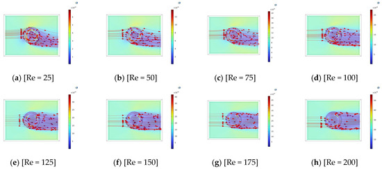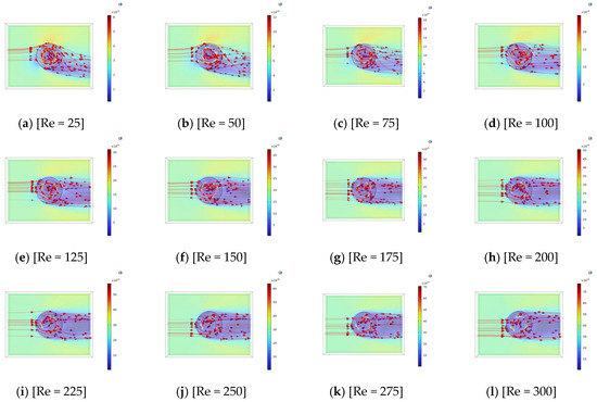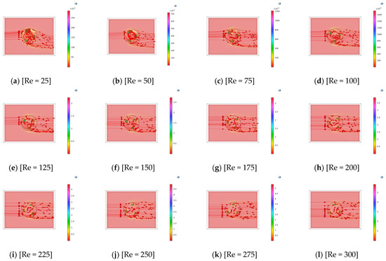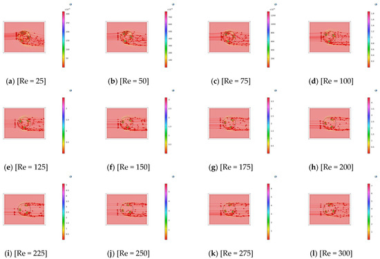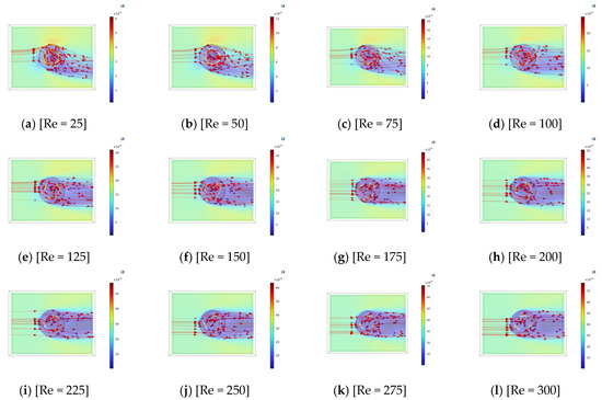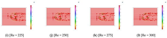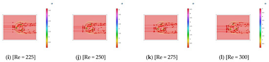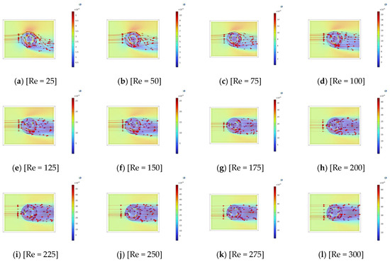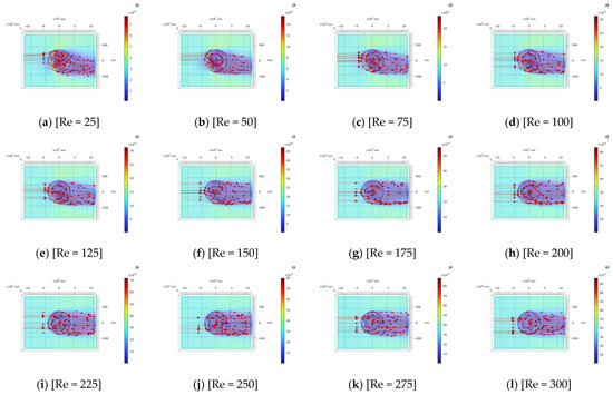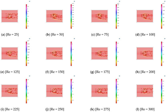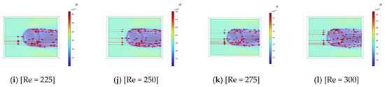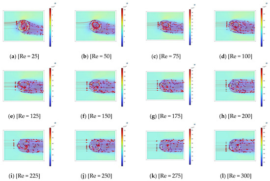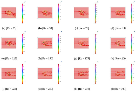Velocity magnitude contours and streamlines for blade model M1 (transformation depth RD = −50 mm) at Reynolds numbers of (a) 25, (b) 50, (c) 75, (d) 100, (e) 125, (f) 150, (g) 175, (h) 200, (i) 225, (j) 250, (k) 275, and (l) 300. The arrow represents velocity magnitude streamlines for blade model M1.