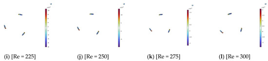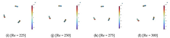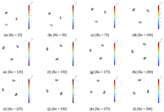 For model M2 (RD = −30 mm), the vortical structures remained well-defined but exhibited slightly lower peak magnitudes than those of M1, particularly at lower Reynolds numbers (Figure 17a). This suggests a minor decrease in aerodynamic loading but retains sufficient coherence for stable torque production. As the Reynolds number increased, the wake vortices experienced moderate interaction and broadening (Figure 17b–l), reflecting a slight increase in turbulence intensity. Despite this, vortex shedding maintained relatively consistent spatial and temporal characteristics, supporting an aerodynamic performance that was superior to that of less convex geometries. The maintenance of coherent vortices at moderate Reynolds numbers implies a stable aerodynamic environment conducive to sustained power output and reduced mechanical fatigue.