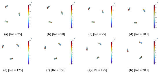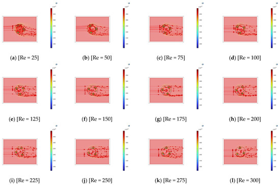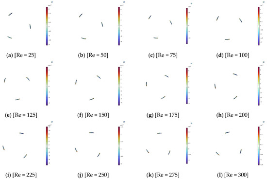 The baseline concave blade model M4 (RD = 0 mm) showed a further decline in the pressure distribution quality. Even at relatively low Reynolds numbers (Re = 50, Figure 12b), the pressure field exhibits large stagnation areas with diminished pressure differentials, which significantly restricts lift production. As the Reynolds number increased, the pressure contours became highly irregular and scattered (Figure 12c–l), with prominent adverse gradients and separated-flow regions. These characteristics contribute to the strong turbulent wakes and broad velocity deficits observed in the velocity field, resulting in increased aerodynamic drag and low power extraction efficiency. Pressure-induced flow separation is a key factor underlying the inferior performance of traditional concave blade designs.
